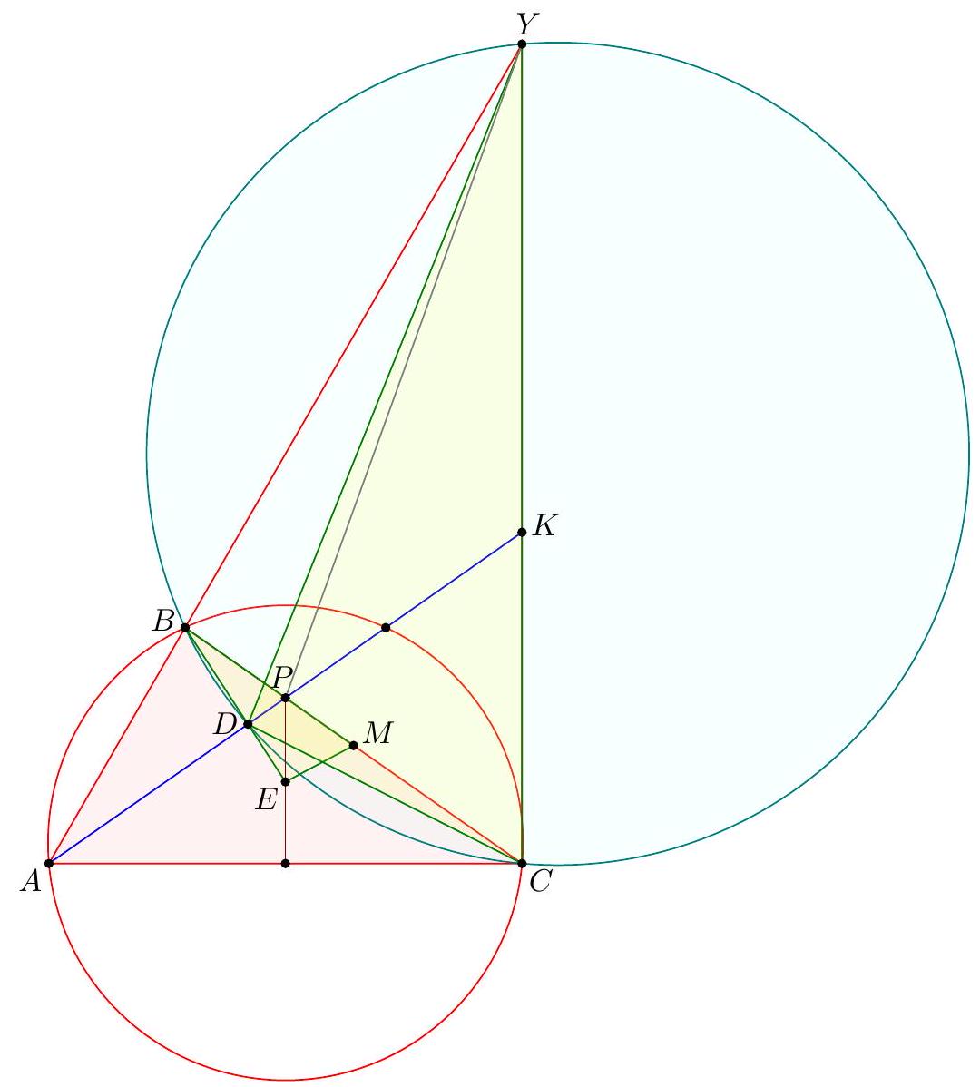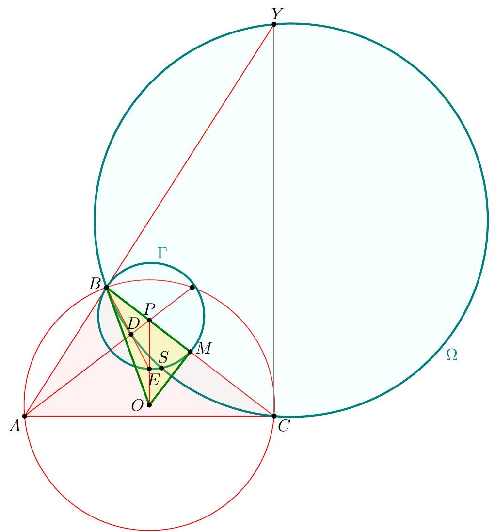 Claim - We have DQCF is cyclic. $$ \begin{aligned} \measuredangle F D C & =-\measuredangle C D B=180^{\circ}-\left(90^{\circ}+\measuredangle C A B\right)=90^{\circ}-\measuredangle C A B \\ & =90^{\circ}-\measuredangle Q C A=\measuredangle F Q C . \end{aligned} $$ To conclude, note that $$ \measuredangle B E M=\measuredangle B F C=\measuredangle D F C=\measuredangle D Q C=\measuredangle A Q C=\measuredangle A B C=\measuredangle A B M . $$ Remark (Motivation). Here is one possible way to come up with the construction of point $F$ (at least this is what led Evan to find it). If one directs all the angles in the obvious way, there are really two points $D$ and $D^{\prime}$ that are possible, although one is outside the triangle; they give corresponding points $E$ and $E^{\prime}$. The circles $B E M$ and $B E^{\prime} M$ must then actually coincide since they are both alleged to be tangent to line $A B$. See the figure below.  One can already prove using angle chasing that $\overline{A B}$ is tangent to $\left(B E E^{\prime}\right)$. So the point of the problem is to show that $M$ lies on this circle too. However, from looking at the diagram, one may realize that in fact it seems $$ \triangle M E E^{\prime} \stackrel{\triangle}{\sim} \triangle C D D^{\prime} $$ is going to be true from just those marked in the figure (and this would certainly imply the desired concyclic conclusion). Since $M$ is a midpoint, it makes sense to dilate $\triangle E M E^{\prime}$ from $B$ by a factor of 2 to get $\triangle F C F^{\prime}$ so that the desired similarity is actually a spiral similarity at $C$. Then the spiral similarity lemma says that the desired similarity is equivalent to requiring $\overline{D D^{\prime}} \cap \overline{F F^{\prime}}=Q$ to lie on both $(C D F)$ and $\left(C D^{\prime} F^{\prime}\right)$. Hence the key construction and claim from the solution are both discovered naturally, and we find the solution above. (The points $D^{\prime}, E^{\prime}, F^{\prime}$ can then be deleted to hide the motivation.) I A Menelaus-based approach (Kevin Ren). Let $P$ be on $\overline{B C}$ with $A P=P C$. Let $Y$ be the point on line $A B$ such that $\angle A C Y=90^{\circ}$; as $\angle A Y C=90^{\circ}-A$ it follows $B D Y C$ is cyclic. Let $K=\overline{A P} \cap \overline{C Y}$, so $\triangle A C K$ is a right triangle with $P$ the midpoint of its hypotenuse.  Claim - Triangles $B P E$ and $D Y K$ are similar. Claim - Triangles $B E M$ and $Y D C$ are similar. $$ \frac{B P}{B C} \frac{Y C}{Y K} \frac{A K}{A P}=1 $$ Since $A K / A P=2$ (note that $P$ is the midpoint of the hypotenuse of right triangle $A C K)$ and $B C=2 B M$, this simplifies to $$ \frac{B P}{B M}=\frac{Y K}{Y C} $$ To finish, note that $$ \measuredangle D B A=\measuredangle D B Y=\measuredangle D C Y=\measuredangle B M E $$ implying the desired tangency.  Denote by $S$ the second intersection of $\Gamma$ and $\Omega$. The main idea behind is to consider the spiral similarity $$ \Psi: \Omega \rightarrow \Gamma \quad C \mapsto M \text { and } Y \mapsto B $$ centered at $S$ (due to the spiral similarity lemma), and show that $\Psi(D)=E$. The spiral similarity lemma already promises $\Psi(D)$ lies on line $B D$. Claim - We have $\Psi(A)=O$, the circumcenter of $A B C$. Claim - $\Psi$ maps line $A D$ to line $O P$. $$ \measuredangle(\overline{A D}, \overline{O P})=\measuredangle A P O=\measuredangle O P C=\measuredangle Y C P=\measuredangle(\overline{Y C}, \overline{B M}) $$ As $\Psi$ maps line $Y C$ to line $B M$ and $\Psi(A)=O$, we're done. Hence $\Psi(D)$ should not only lie on $B D$ but also line $O P$. This proves $\Psi(D)=E$, so $E \in \Gamma$ as needed.